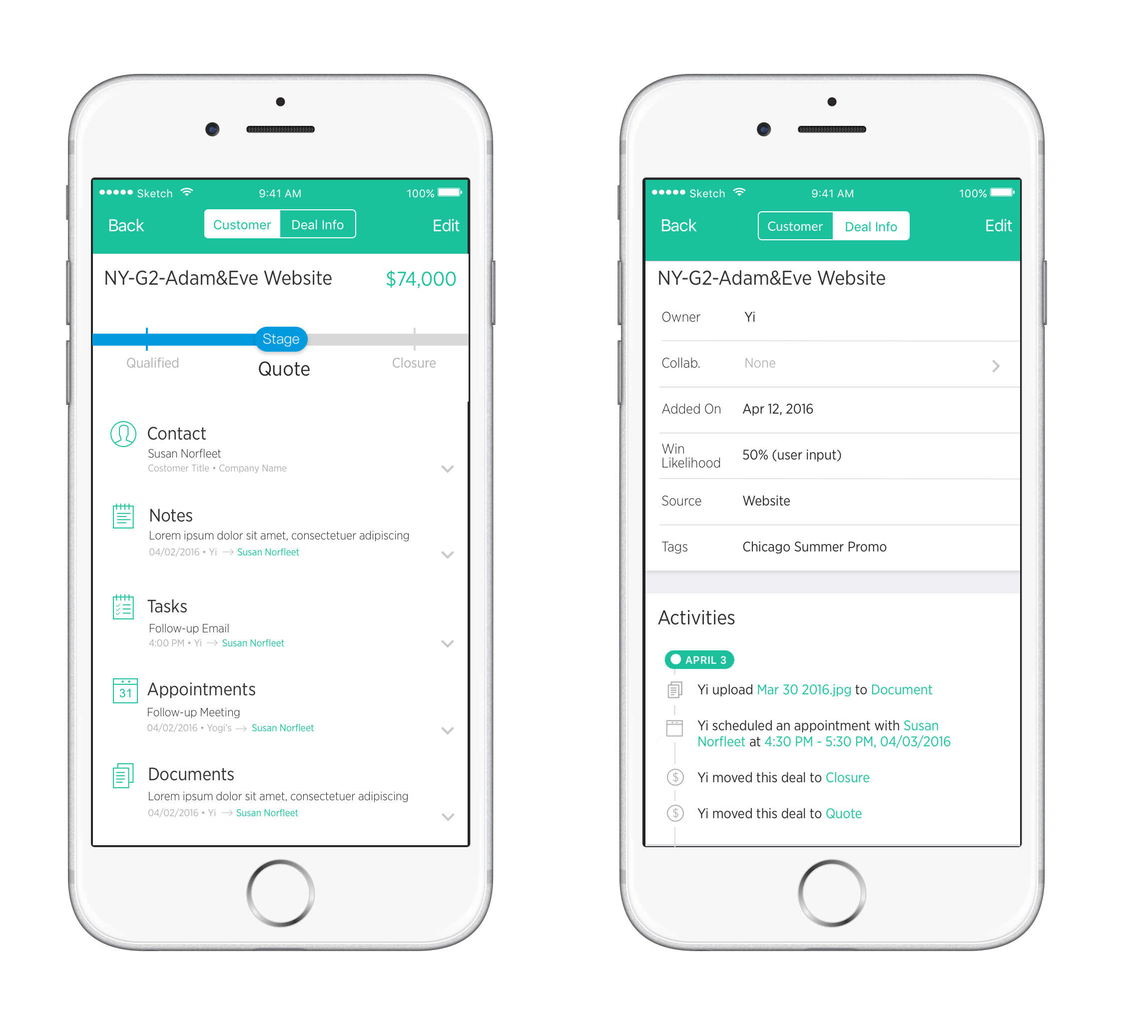 The list of category supports adding more category. To provide user enough space to view this information, basic deal information will collapse but also display the most important information of this deal. When user wants to change the stage, they can go back simply by scrolling back.