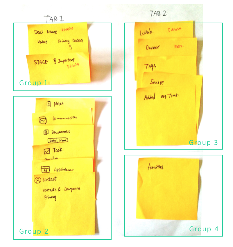 According to the user research and my understanding of how CRM works, I regroup the information of current deal profile based on the frequency users will view or add data. One participant mentioned that he will use activities and collaborator when there are new team members involved in the deal, so I put this information into the second tab.