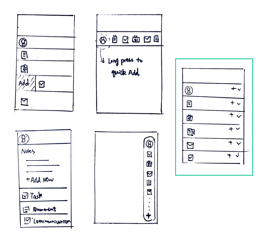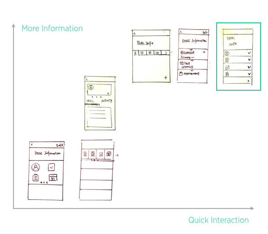 In order to solve the scalability issue as well as provide the possibility to customize deal profile, I sketch out several concepts. Base on sales person’s needs of viewing more information at one time and quick interaction, I organized these concepts and select one to develop further.